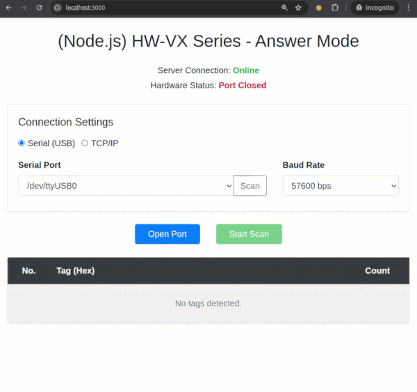 Dengan Node.js, kita bisa membangun aplikasi yang mampu berkomunikasi dengan perangkat reader melalui dua jalur sekaligus: menggunakan jalur Serial (RS-232) untuk perangkat yang terhubung langsung, maupun melalui TCP/IP Socket (LAN/Ethernet) untuk perangkat yang berada di jaringan. Artinya, mau pakai kabel USB to RS232 Cable biasa ataupun kabel jaringan (LAN), kita bisa mendeteksi dan mengirim data bytes tanpa perlu perantara aplikasi lain.